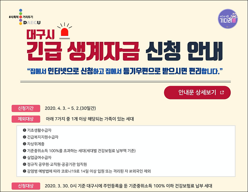 지난 11일부터 사흘동안 236만 명에게 3조2천억 원 넘는 돈이 지급됐습니다. 확인지급 신청대상은 지원요건을 충족하나 추가 증빙서류(공동대표, 가족계좌 신청, 조합 등)가 필요한 사업자와 지자체에서 '행정명령 이행 * 법인의 경우 법인 명의로만 신청 가능. 공인인증서 로그인을 하실 경우 무방문 신청 및 조회 서비스 모두를 이용하실 수 있습니다. 그렇다면 버팀목 전세자금대출 조건은 어떻게 될까요? 구례군 구례군, 2021년도 상반기 귀농인 농업창업 및 주택구입 자금 신청자 모집.